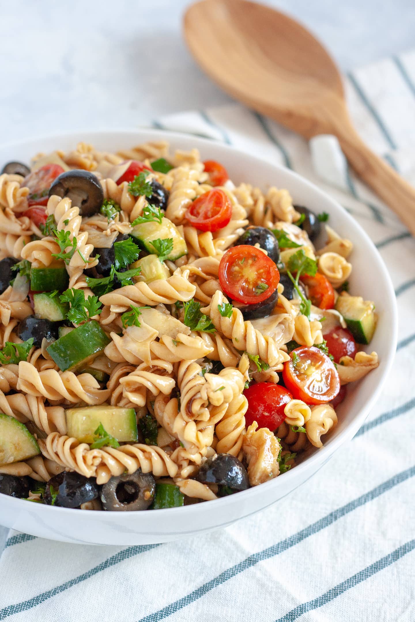 Below is a favorite recipe of mine for Pasta Salad. It is super easy and can be put together in minutes.