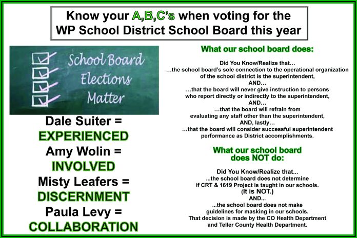 Dale Suiter, a Divide resident, is a member of Pikes Peak Kiwanis and the Spring Valley Water Board. He brings to the table seven years of school board experience from Buhler School District in Kansas. Amy Wolin currently has kids in the WPSD and engages with students, parents and teachers regularly through her position at the Rampart Range Library District. She has also initiated numerous fundraising efforts for different organizations in the school system. Misty Leafers has a background in law, teaching and is parent to a former WPSD student. She taught both history and English at WPMS. She’s also juggling being an active hockey mom! Paula Levy is a local business owner and nonprofit advocate. She is currently a member of Toastmasters Above the Clouds, The Golden Bridge Network, Rotary Club, and the Commission on Aging. She’s also had all three of her kids graduate from the WPSD who are now either in college or leading successful business careers of their own. All four of these candidates want to bring respect and civility to the WPSD school board. All are in agreement that the school board is no place for politics and that they each want to bring their best to the table in the interest of the kids in the district. Please vote November 2.
