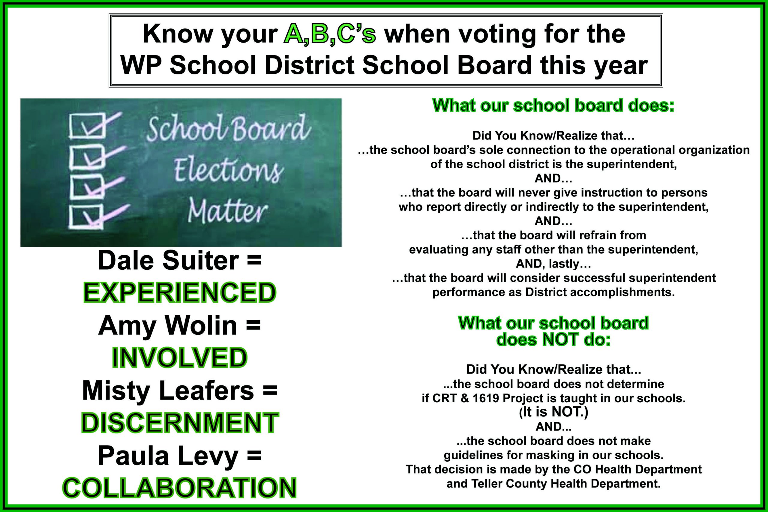 The WPSD board’s job is not to determine curriculum. It is not hiring or firing district employees other than the Superintendent. It is not determining current health situations in the community. This is the responsibility of the Colorado State Health Department and the Teller County Health Department. The board’s job is also not to engage in complaints or issues between students, parents and teachers. That is handled directly by the school principal, and if unresolved is addressed by the Superintendent.