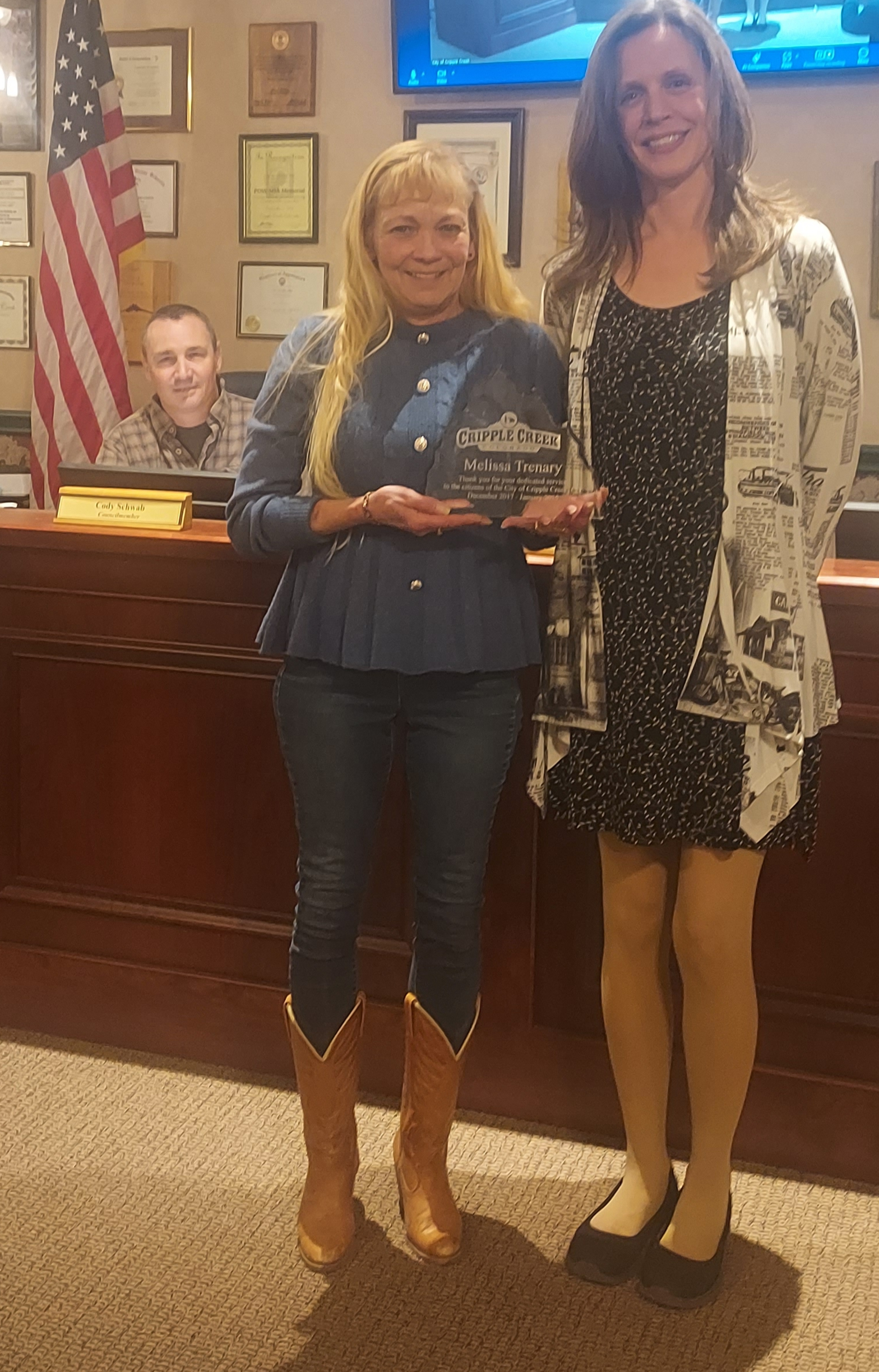 The change was mostly highlighted by a final tribute to outgoing council member Melissa (Missy) Trenary, who actually briefly served as the first female mayor for Cripple Creek for a brief period. Trenary recently stepped down from her council position due to term limits after serving two terms (a total of eight years) as the town’s Ward Five representative. Trenary, who is employed in the local gaming industry, also has served with a variety of local organizations, such as the Cripple Creek District Museum, the Two Mile High Club and the Cripple Creek Elks, and once even worked as a history columnist for TMJ.