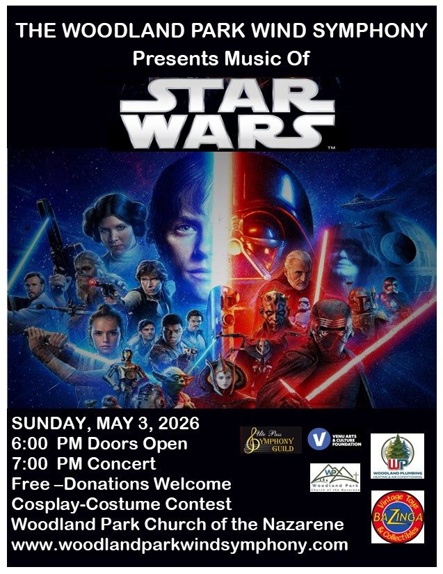 The Woodland Park Wind Symphony, in an ambitious outing, will perform the music of “Star Wars” on May 3 at Church of the Nazarene (900 Evergreen Heights Drive), in a venue well-known for its impressive acoustics. The free concert begins at 7 p.m. But the doors open at 6 p.m. for registration for a rare and unique costume contest, concert seating, and photo opportunities.